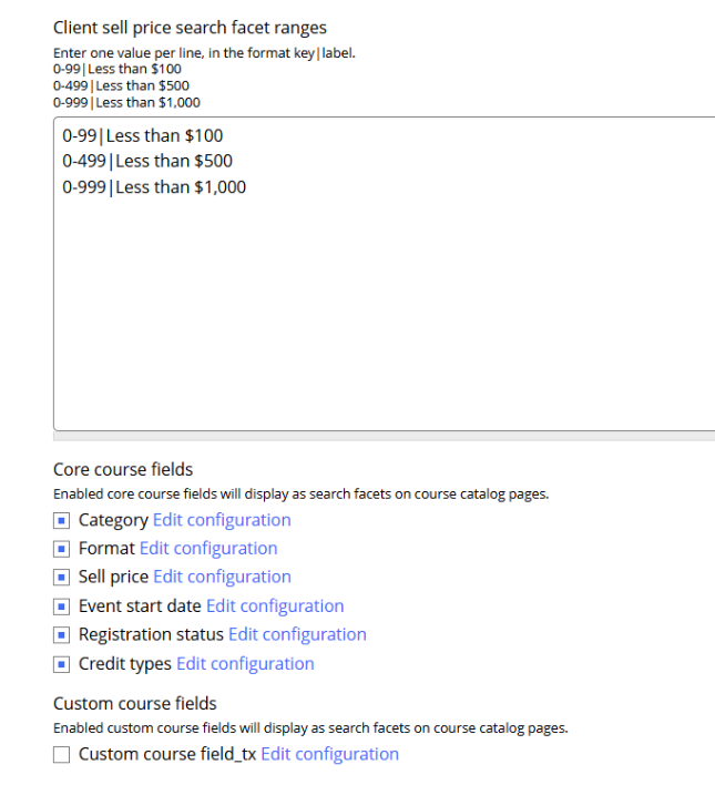 This will allow site admins to modify catalog and search configurations including sell price range, core and custom course fields facet ordering and filtering display (Fig 2).